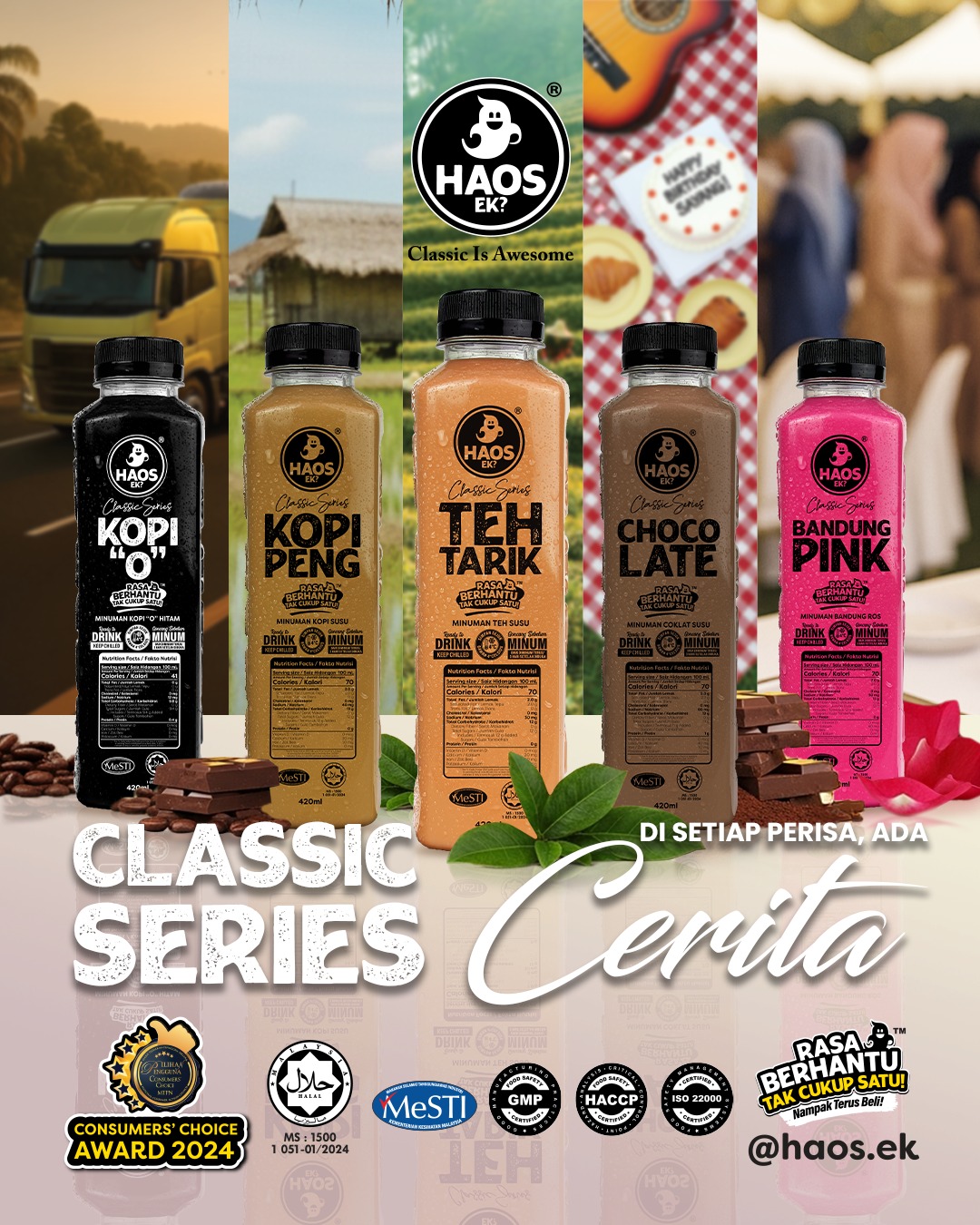 DI SETIAP PERISA, ADA CERITA. Haos Ek? Classic Series bukan sekadar minuman, ia komitmen kami untuk mengekalkan nilai rasa Malaysia yang sebenar. Setiap perisa dibangunkan melalui proses formulasi yang teliti, disokong oleh standard kawalan kualiti bertaraf GMP, HACCP, ISO 22000 serta diiktiraf Halal. Agar setiap botol